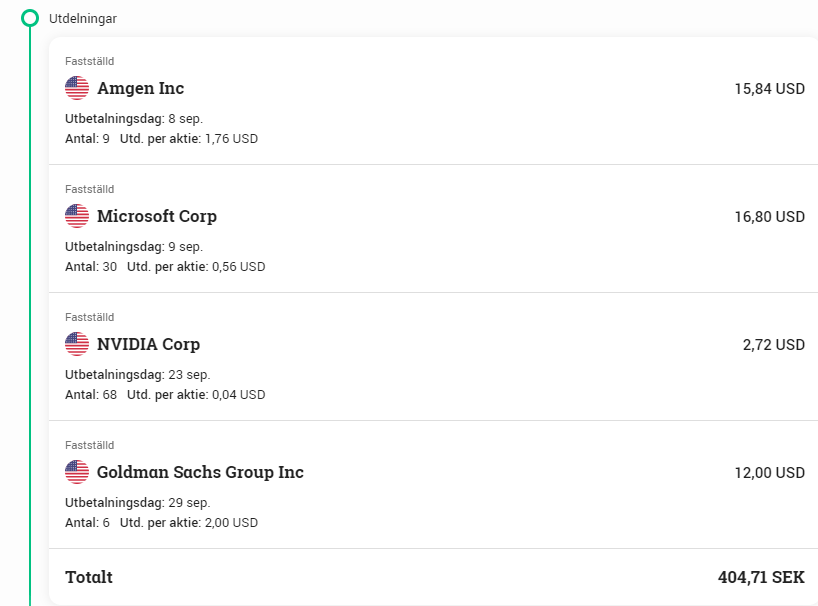 Exemplet ovan är från min portfölj hos Avanza, som indikerar på att jag kommer erhålla ca 400 kronor brutto i utdelningar för septembermånad. Räknar vi även med Addtech som redan har utskiftat utdelningen den första september så stiger brutto utdelningen till ca 780 SEK för månaden.
