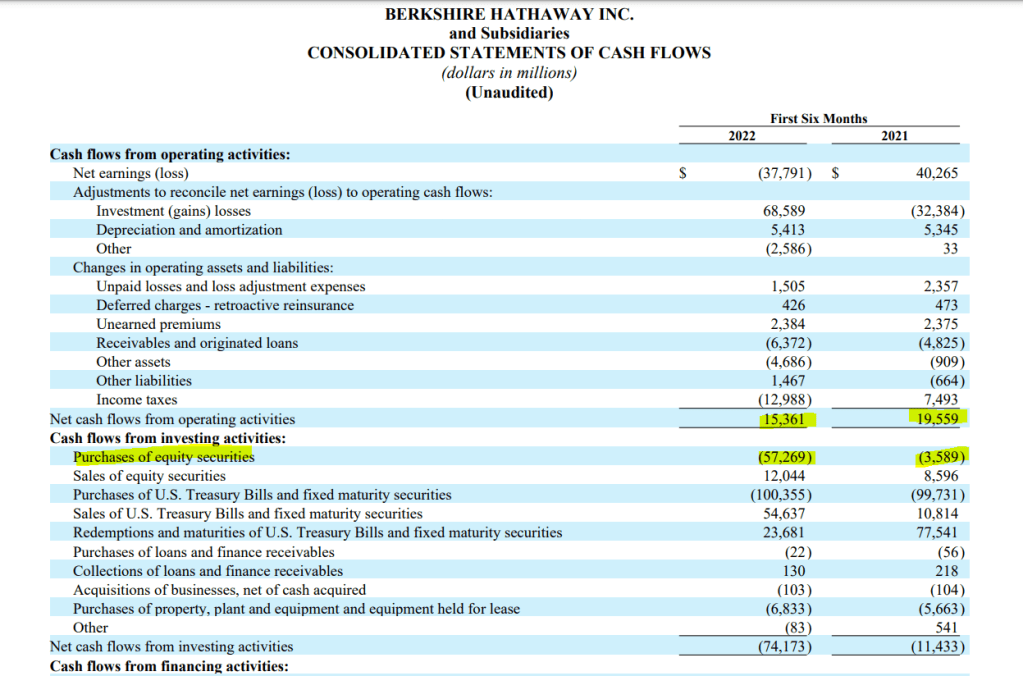 Om vi kikar på köp av aktier vilket motsvarar ”purchases of equity securities” så har Berkshire Hathaway varit väldigt aktiva dom första 6 månaderna vs i fjol.