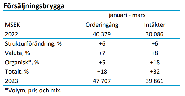 - Orderingången ökade 18% till MSEK 47 707 (40 379), en organisk ökning med 5%
